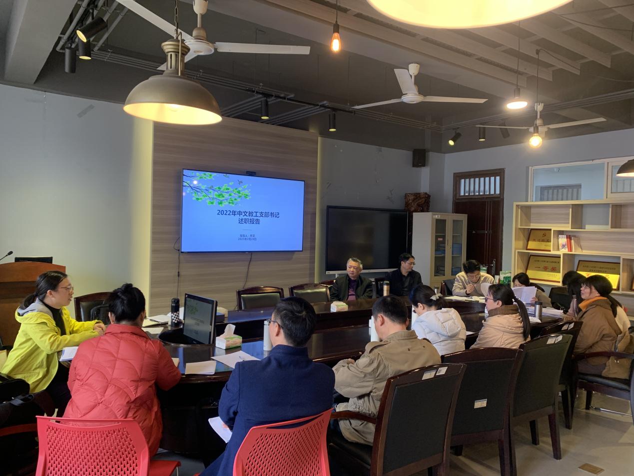 接着,支部书记黄莹代表支部作了2022年度工作报告。报告认真回顾了本支部在过去一年中取得的成绩,并指出支部在2022年度工作中存在的问题,同时提出在2023年度持续改善的设想与方案。周云鹏副院长、系主任郑劭荣及其他支部成员先后发言,高度评价黄莹书记所作报告,充分肯定本支部过去一年中的扎实工作、丰硕成果,并期待再接再厉,取得更大的成绩。同时对本支部今年将要开展的工作表示积极参与、努力有为,做实工作,共同建设好中文教工党支部,并争取冲击更高级别的荣誉。