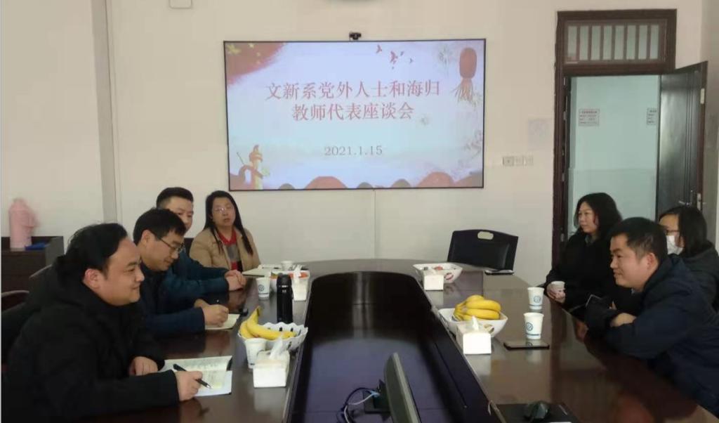 为进一步推动统一战线工作,更好发挥各民主党派、党外人士参与系改革发展、建言献策的积极作用,1月15日下午,文新系在文科楼B505会议室召开党外人士和海归教师代表座谈会,系党总支书记伍接朝、统战委员魏桃初、组织委员耿蕊,无党派人士易彬教授、致公党党员王福雅副教授、海归教师代表陈璐、叶昭源老师和系党政办、学工办主任出席了座谈会。会议由魏桃初同志主持。
