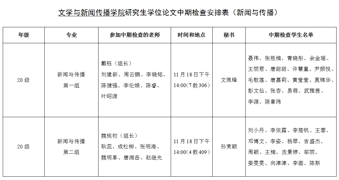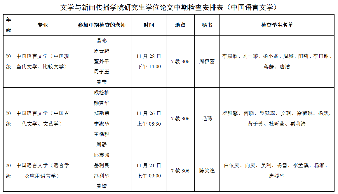 文学与新闻传播学院研究生学位论文中期检查安排表