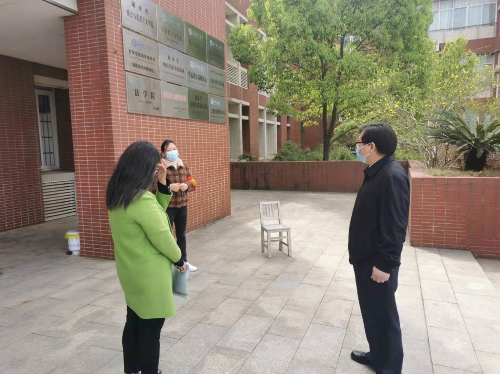刘建民首先在文科楼大门检查了大门值班和党员先锋岗设置情况,检查出入大门扫场所码和出示健康码的情况,慰问一线值班人员。随后来到学院办公区域,了解目前学院疫情防控和师生健康状态等情况,学院党委书记伍接朝一一做了汇报,在了解情况后,他表示,学院党委高度重视疫情防控工作,做到了把疫情防控工作当做当前最重要的政治任务来抓,管控有力,措施到位,希望在下一步要更加细化管理,强化措施,确保学院师生健康,稳定有序运行。刘建民强调,在抓好疫情防控的同时,要系统谋划好学院发展大事,在博士点申报、专业建设、科学研究等内涵建设上下功夫。