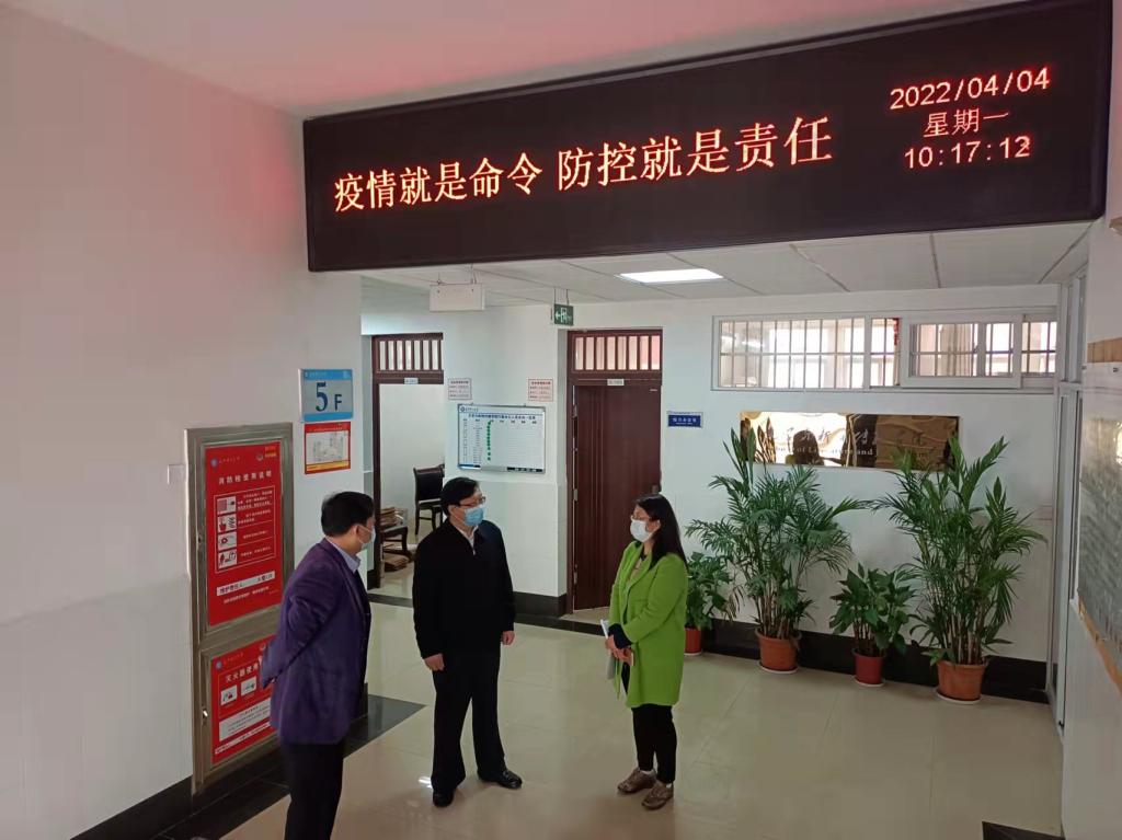 4月4日上午,学校党委副书记刘建民再次来到学院检查指导疫情防控工作,学院党委书记伍接朝、副院长耿蕊陪同检查。