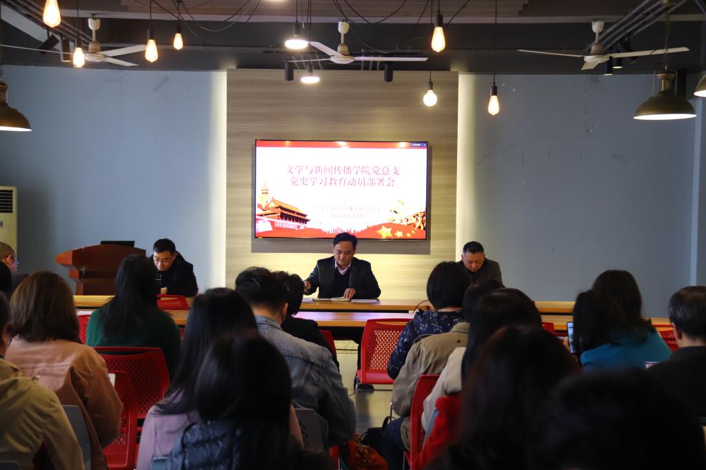3月23日下午,文新学院在文科楼B501举行党史学习教育动员部署会。院党总支书记伍接朝主持并做动员。