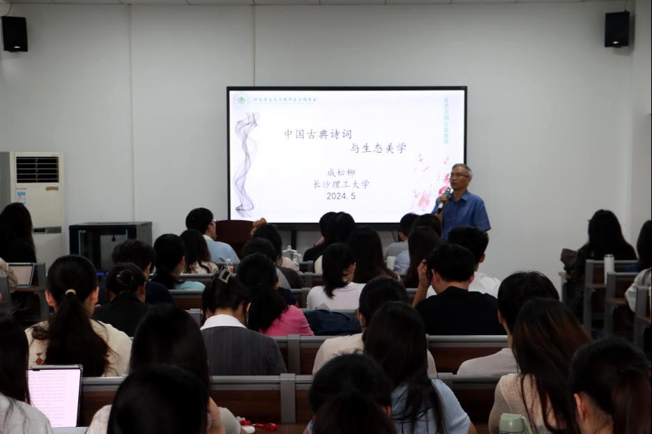 2024年5月21日下午,永利集团88304官网文新学院通识讲座暨人文素质大讲堂之“中国古典诗词与生态美学”专题讲座在金盆岭校区9教417室举行。湖南省人民政府参事、中文系二级教授成松柳老师为长理师生带来了一场富有人文气息的古典诗词盛宴。成松柳教授首先对“古典诗词生态美学的艺术呈现”进行了阐述。他将中国古典诗词生态美学的呈现方式分为“自然本身的和谐”、“人与自然万物的和谐”、“人与社会的和谐”三个方面,以李白、王维、刘禹锡、张孝祥、朱熹等人的传世诗词为例,围绕“楼观岳阳尽,川迥洞庭开”“相看两不厌,唯有敬亭山”“空山不见人,但闻人语响”“试问西山雨,何如湘水春”进行了诗意解读,详细阐释了“主客一体”“仁爱万物”“江山之助”“天地境界”等观点。成松柳教授提出:中国古代诗歌并非纯粹客观地描摹自然风物,古代文人将浓厚意趣与真挚情感熔铸于自然山水,体现了对自然的审美感知,这种与自然的亲近友好关系承载着博大深沉的生命情怀。