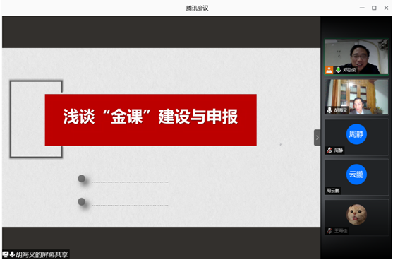 1125日晚上730,湖南师范大学文学院教授、博士生导师胡海义应邀为我系教师做了一场题为“‘金课’建设与申报”的线上讲座。讲座由中文系主任郑劭荣教授主持,文学与新闻学系副主任周云鹏、中文系全体教师、新闻系部分教师参加了此次讲座。