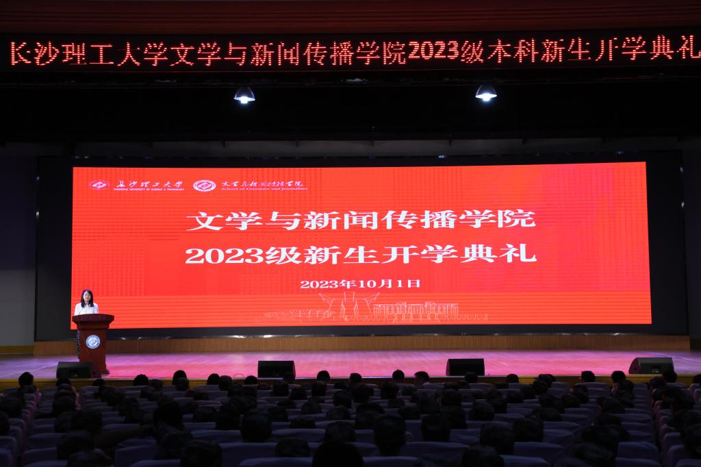 2023年10月1日上午,永利集团88304官网文学与新闻传播学院在金盆岭校区5教报告厅举行2023级本科新生开学典礼,院长刘建新、院党委副书记(主持工作)陈仁凯、副院长周云鹏、戴钰、院党委委员郑劭荣、优秀校友曾高飞、蔺晨阳、系部主任、支书、行政办公室主任、新生班主任及辅导员出席,全体2023级新生参加。典礼由院党委副书记刘莎主持。