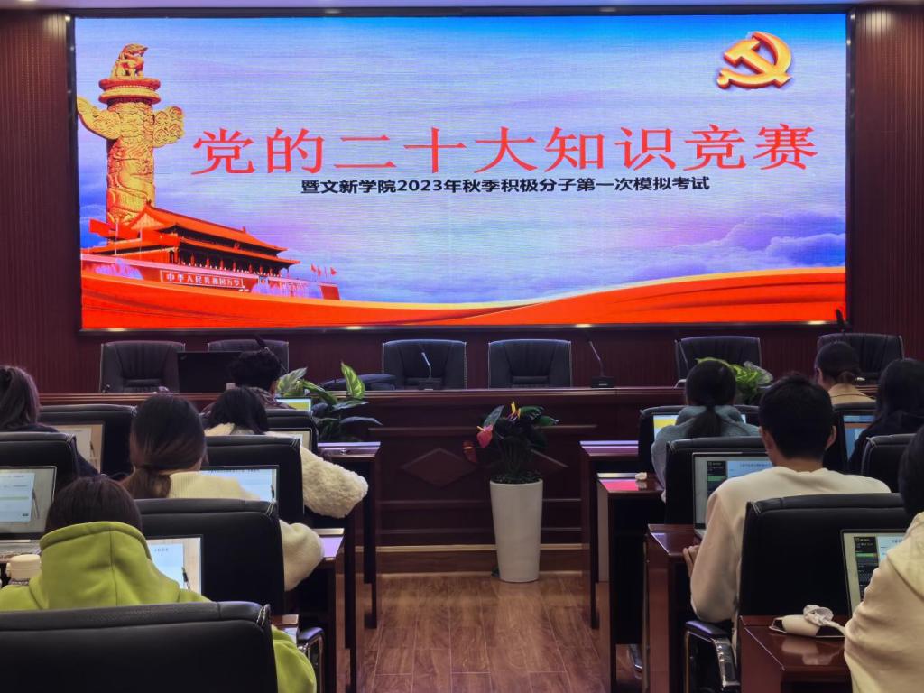 为深入落实并贯彻落实党的二十大精神,积极探索“互联网+党建”的新模式,进一步提升积极分子的理论知识能力水平,11月20日12时30分,“党的二十大知识竞赛暨文新学院2023年秋季入党积极分子第一次模拟考试”于永利官网金盆岭校区九号教学楼218室成功举行。