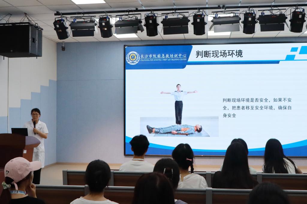 首先,肖罗英强调了心肺复苏的重要性,鼓励同学们广泛参与、积极学习。随后,她向同学们介绍了评估现场环境、判断患者意识、胸外按压、开放气道、人工呼吸五个心肺复苏的基本步骤,并亲自演示了胸外按压时的手势。