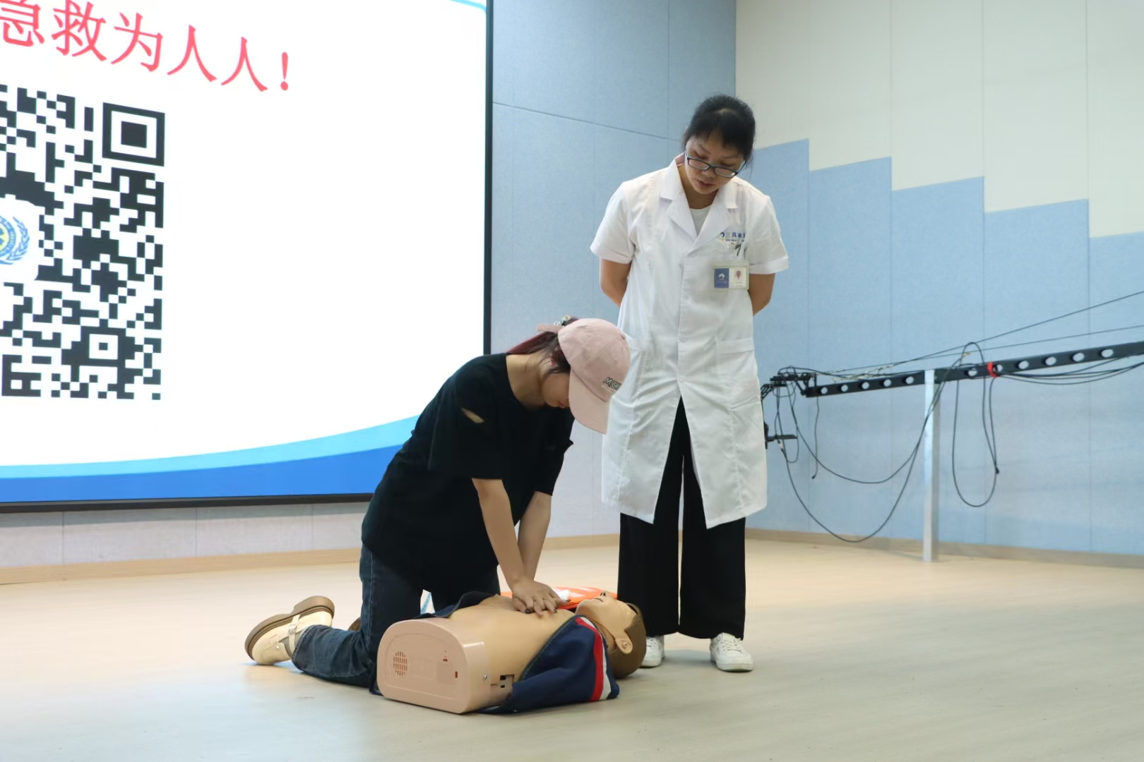最后,为确保学生能够在突发急救事件时迅速做出反应,并提供正确的急救措施,肖罗英准备了模拟人偶和AED,对同学们的学习成果进行检验。在她规范细致的演示过后,同学们纷纷上台进行演练,学习正确的急救方法。