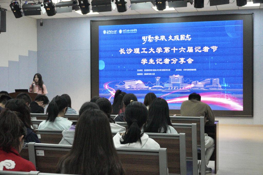 2024年11月5日,由长沙理工大学党委宣传部、教务处、学工部、校团委、研工部主办,我院承办的第十六届记者节学生记者分享会在永利集团88304官网金盆岭校区九教113新闻演播厅举行。本次活动高举“树勤学风 立报国志”的旗帜,旨在促进永利官网新闻人才的交流互鉴,提升学生记者的专业素养。
