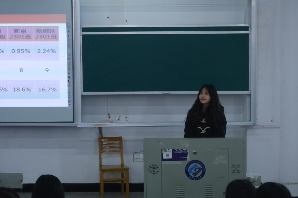 会议首先邀请了汉语言2102班李安楠同学分享大学学业发展及职业规划经历。她从专业课程学习、综合素质拓展、职业能力提升等几个方面进行分享,建议23级同学要明确自身目标及规划,注重提高学习效率,积极参加校院活动,不断积累和提升自己的核心竞争力。随后,由院学生会学创部葛依楠同学做23级大一学年学情数据报告,她详细分析了各专业班级的绩点、挂科率、四六级过级等情况,帮助同学们对自身学习情况有了更全面的了解。