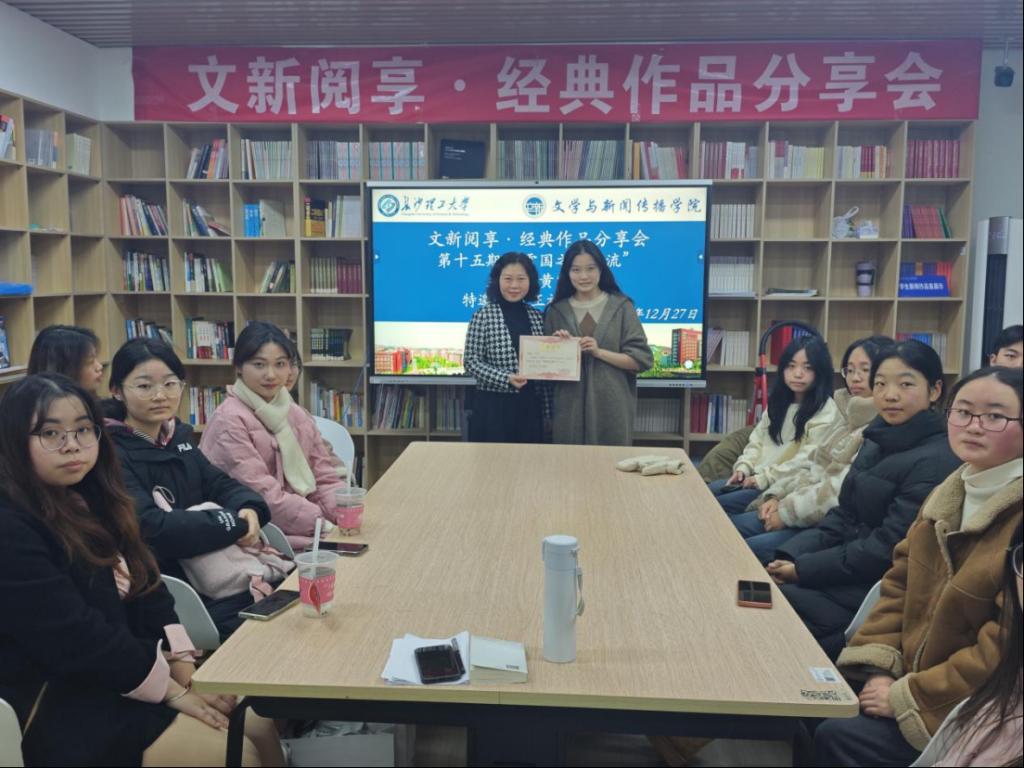 12月27日晚,我院十五期“文新阅享·经典作品分享会”在金盆岭校区九教317师生发展中心举行。汉语言2201班的黄雯静以“雪国之美源流”为题,分享《雪国》这部作品。中文系教师王福雅作为特邀嘉宾出席。