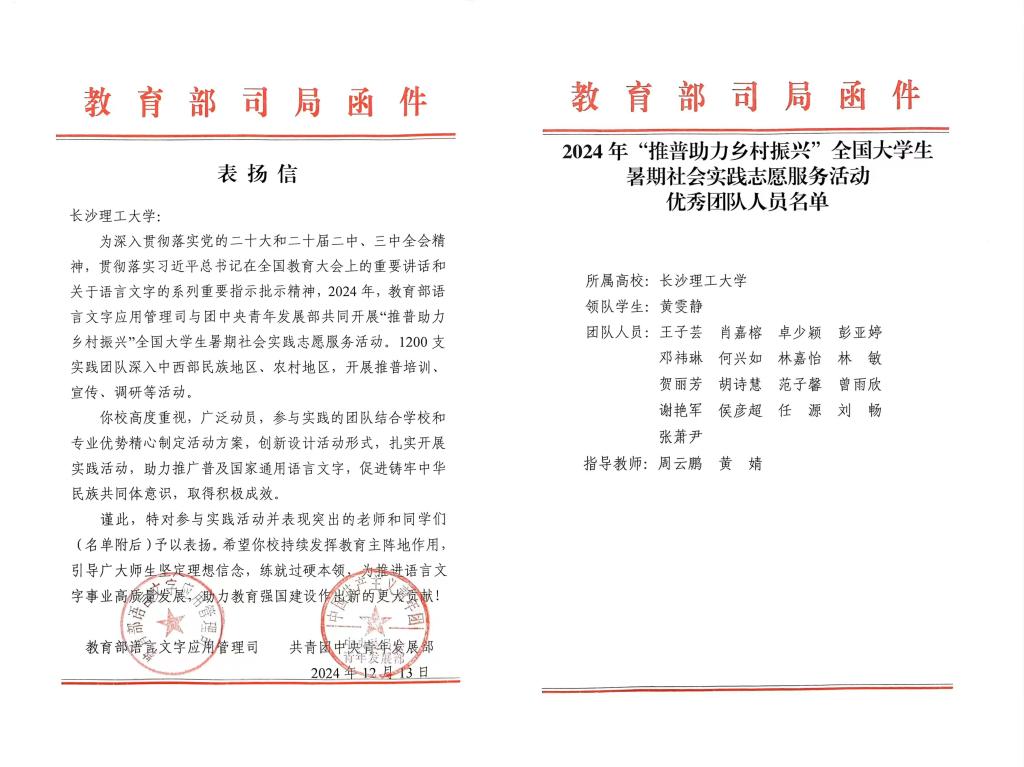 近日,由教育部语言文字应用管理司、共青团中央青年发展部联合开展的2024年“推普助力乡村振兴”全国大学生暑期社会实践志愿服务活动评选结果揭晓,由文新学院组织赴湖南省邵阳市新宁县的“‘语润坪山’永利集团88304官网赴新宁县推普助力乡村振兴”服务队从全国1200支团队中脱颖而出,获评优秀团队,教育部语言文字应用管理司和共青团中央青年发展部来信表扬。