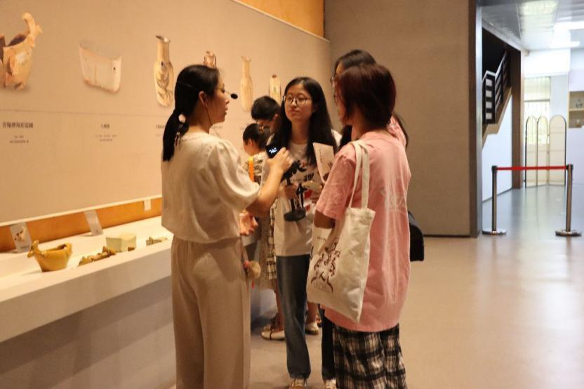 长沙铜官窑博物馆位于长沙市望城区通关街道彩陶源村,是一座以“诗意的彩瓷”为主题展现一千二百多年前唐代长沙铜官窑文化发展史的专题博物馆。跟随着智能语音讲解,实践团依次参观了包括序厅在内的“千年的积淀”“瓦渣坪往事”“土火之艺”“彩韵唐风”“世界的长沙窑”核心展区,深入了解了唐代长沙铜官窑的陶瓷制作工艺及其文化发展脉络、唐代窑炉结构与生产场景、陶艺制作的工艺流程、唐代外贸瓷器的艺术特征与文化影响力及长沙窑陶瓷在古代海上丝绸之路的地位。