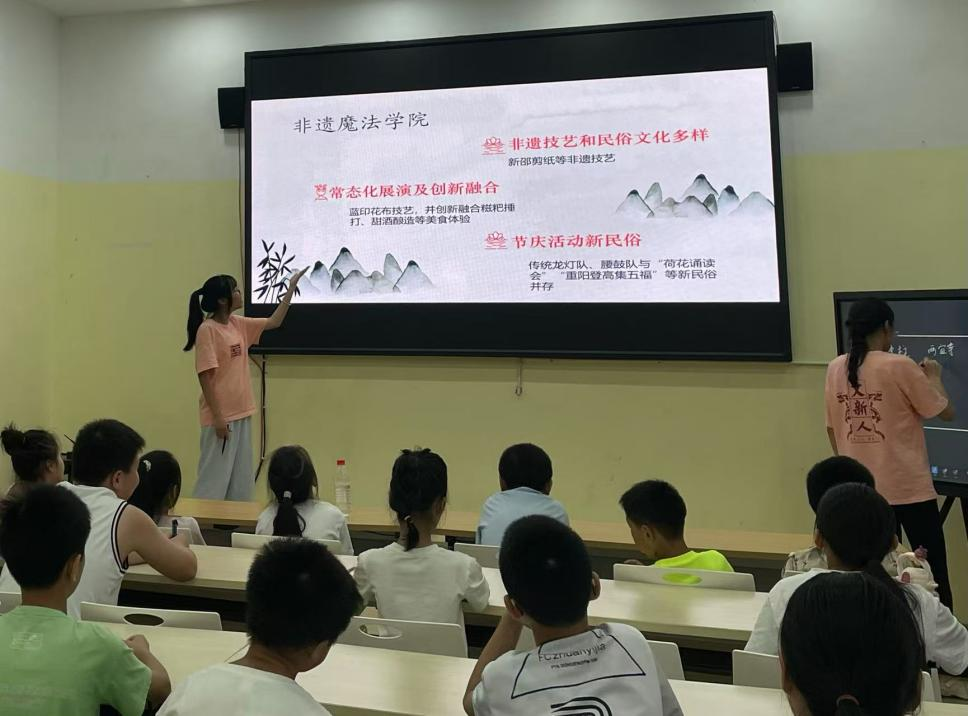 针对这一现状,团队成员们以“你真的熟悉自己的家乡吗”为主题,精心设计“生态农业+特色文化”特色课程。以当地村民熟悉的富硒黄桃、特色红薯等特产为鲜活教材,引导孩子们用标准普通话向“游客”推介来自山野的绿色馈赠;将白水洞的剪纸艺术巧妙融入课堂,让孩子们用普通话讲述纹样背后的故事,指尖的非遗技艺化作自信表达的深厚文化积淀;以水帘洞瀑布、白水古院的青砖白瓦为天然情境,引导孩子们在畅聊家乡山水人文之美的过程中,感受普通话学习的乐趣。