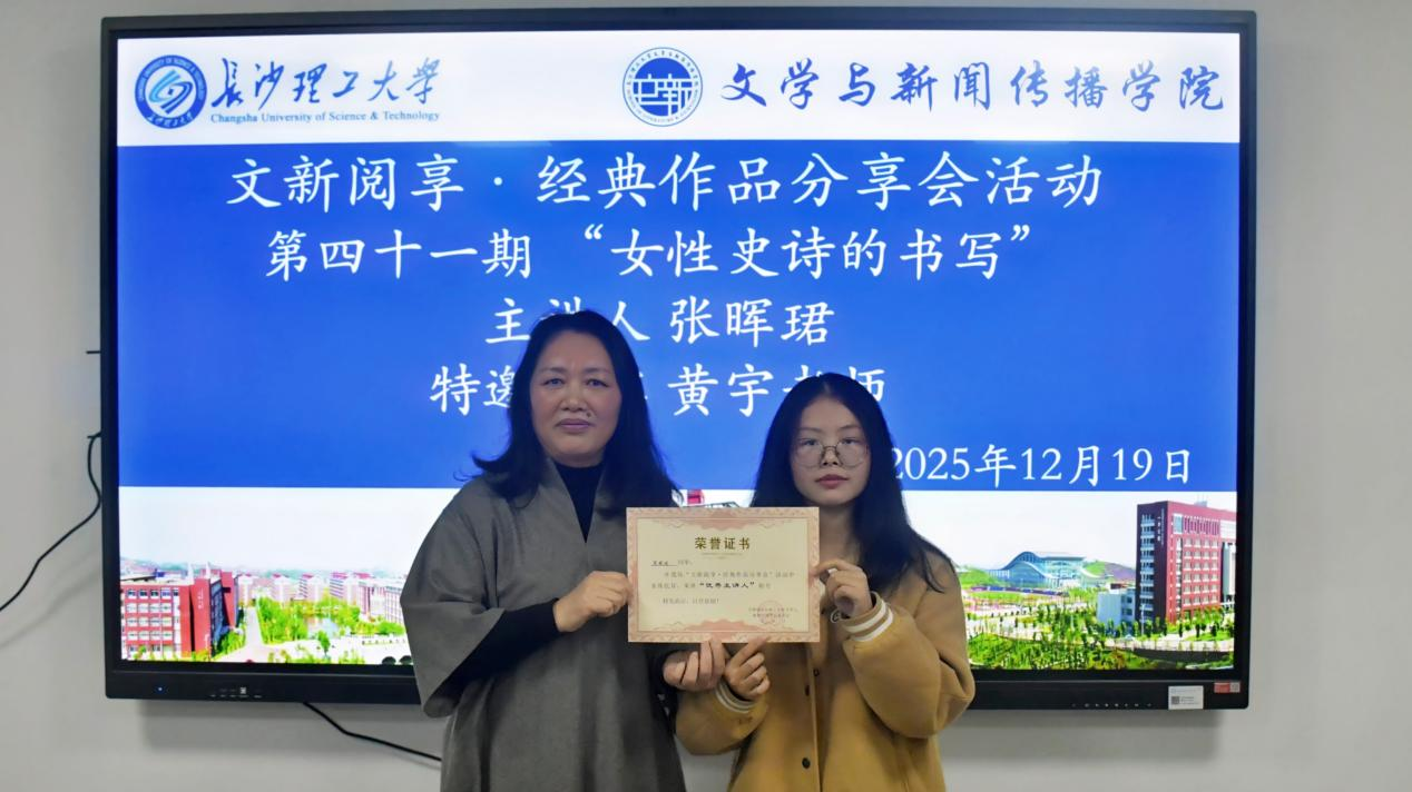 12月19日晚,文新学院第四十一期“文新阅享·经典作品分享会”于金盆岭校区九教223团体成长辅导室顺利举办。本期活动由汉语言2304班张晖珺同学主讲,以“女性史诗的书写”为主题,深入解读了埃莱娜·费兰特的《那不勒斯四部曲》。中文系黄宇老师作为特邀嘉宾参与本次活动。