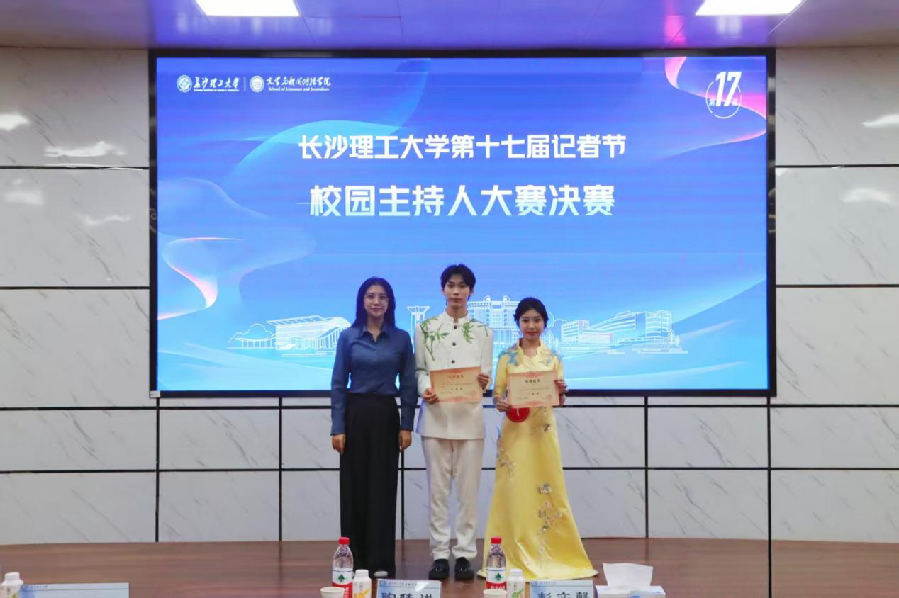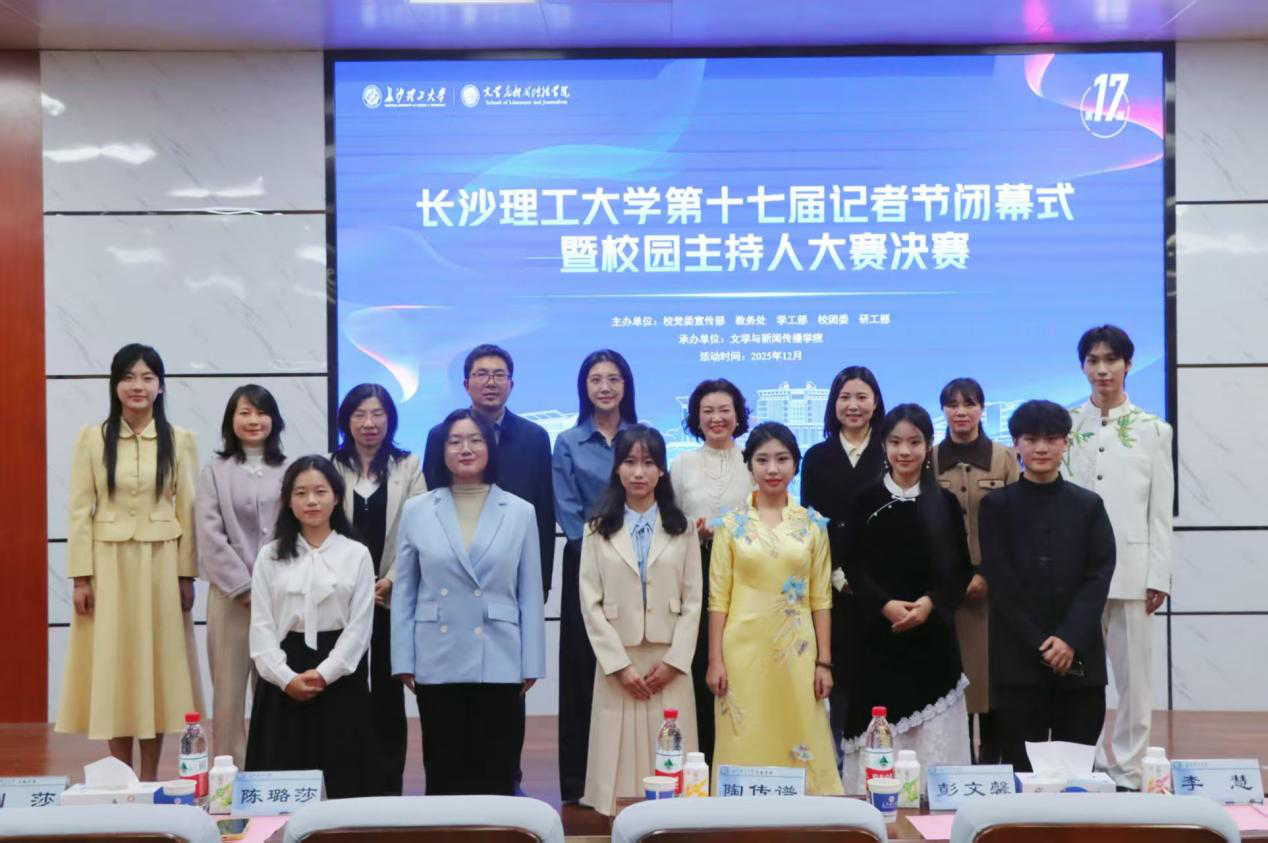 2025年12月19日19:00,由校党委宣传部、教务处、学工部、校团委、研工部主办,文学与新闻传播学院承办的永利集团88304官网第十七届记者节闭幕式暨校园主持人大赛决赛在金盆岭校区四号教学楼108学术报告厅举行。山东广播电视台主持人彭文馨,湖南省朗诵艺术协会支部书记、全国“读书成才女职工”获得者李慧,校团委副书记(主持工作)陈璐莎,校学生工作部副部长陶传谱,校图书馆副研究馆员、国家汉办语合中心国际汉语教师、湖南省语委普通话测试员张雪梅,文新学院新闻系副教授、湖南省高校教学能手曾志华,文新学院党委副书记刘莎出席本次活动并担任评委。