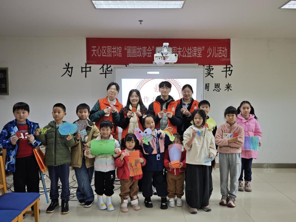 2026年3月,第三十八期阳光周末公益课堂在天心区图书馆温情开讲。恰逢雷锋月,我院志愿者以“春天的祝福——我的第一幅桃符”为主题,将非遗文化与雷锋精神巧妙融合,带领小朋友们走进桃符的前世今生,在剪贴绘画中传递温暖祝福,播撒文化传承的种子。