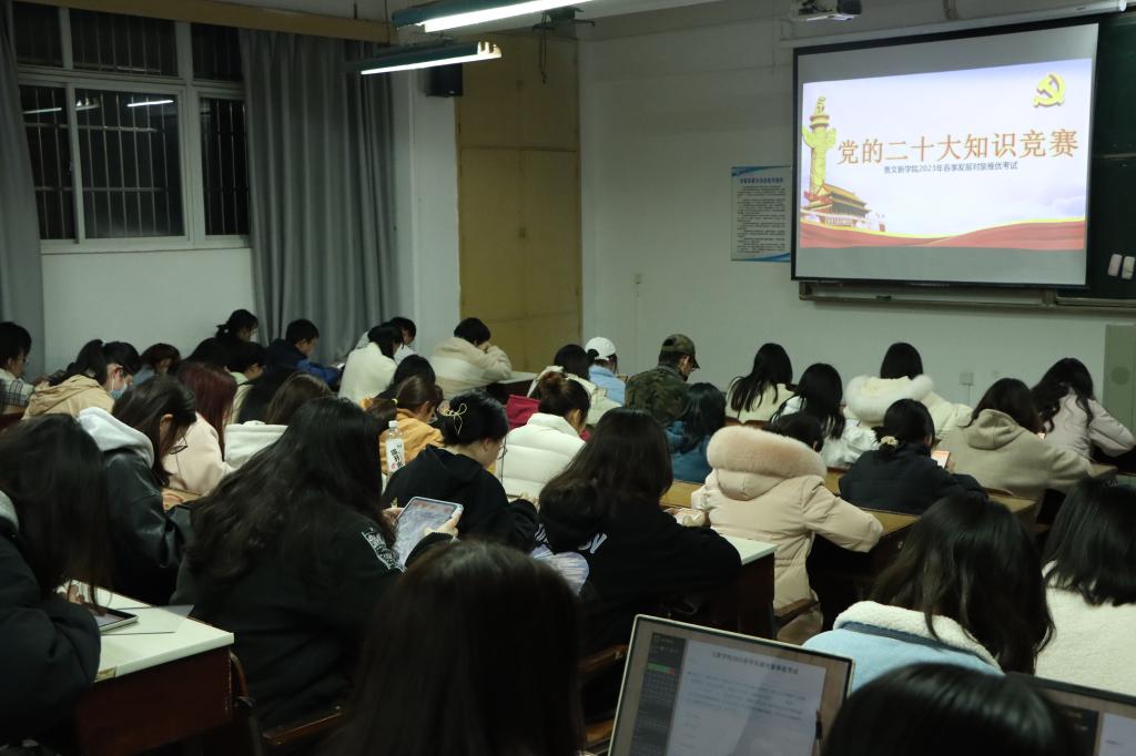 为深入学习与深刻贯彻落实党的二十大精神,积极探索“互联网+党建”新模式,进一步提升入党积极分子的理论知识能力水平,2023年3月28日晚7点30分,“党的二十大知识竞赛暨文新学院2023年春季发展对象推优考试”于永利官网金盆岭校区三号教学楼成功举行。