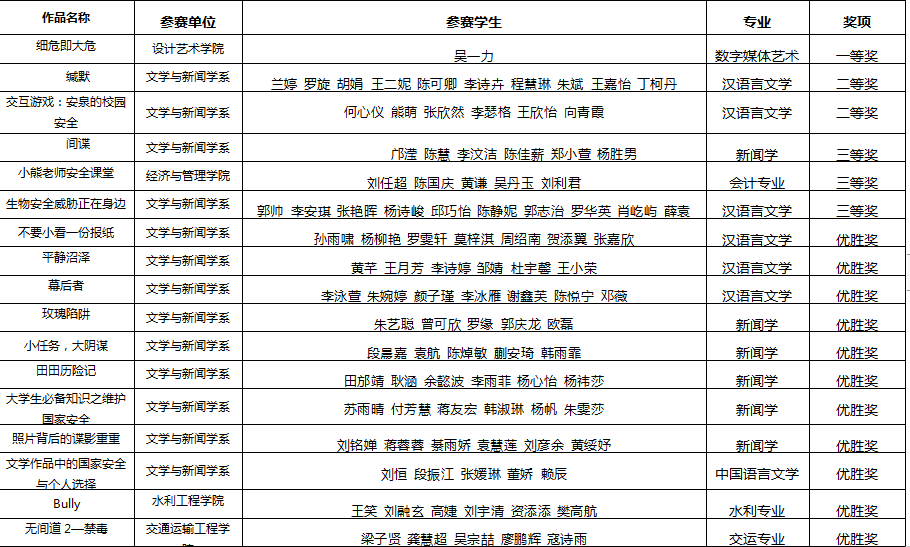 为进一步增强学生的国家安全意识,推进国家安全教育进校园、进课堂、进头脑,营造学生良好的自觉履行维护国家安全责任义务和教育的氛围,切实增强广大师生维护国家安全的意识和能力,永利官网在全校范围内开展了国家安全教育主题微视频比赛。本次微视频活动秉承自愿参加原则,经过初赛、决赛层层选拔,作品《细危即大危》荣获校级一等奖;《缄默》、《安泉的校园安全》荣获校级二等奖;《间谍》、《小熊老师安全课堂》、《生物安全威胁正在身边》等3个作品荣获校级三等奖;《小任务、大阴谋》等11个作品荣获优胜奖。
