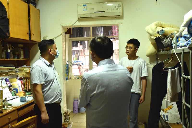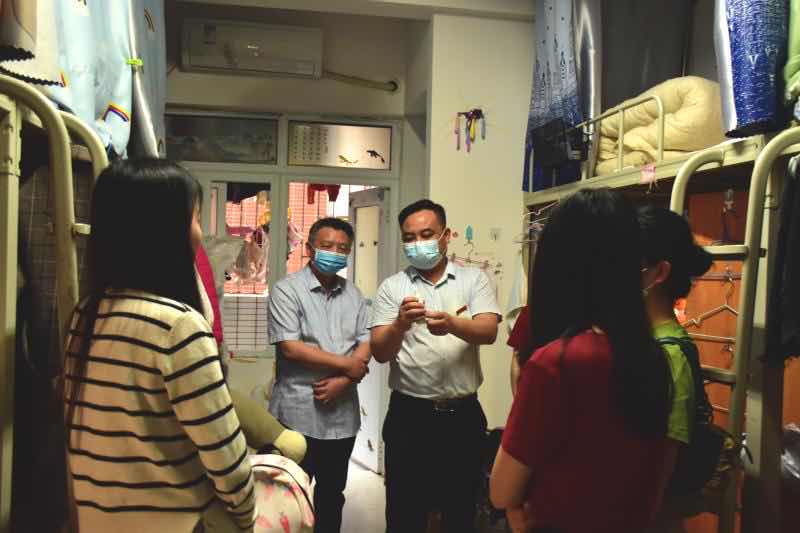 5月21下午文新系党总支副书记伍接朝老师文新系副主任周云鹏老师在辅导员楚艳鸽、吴、刘洋老师的陪同下走访学生宿舍,看望慰问返校毕业生。