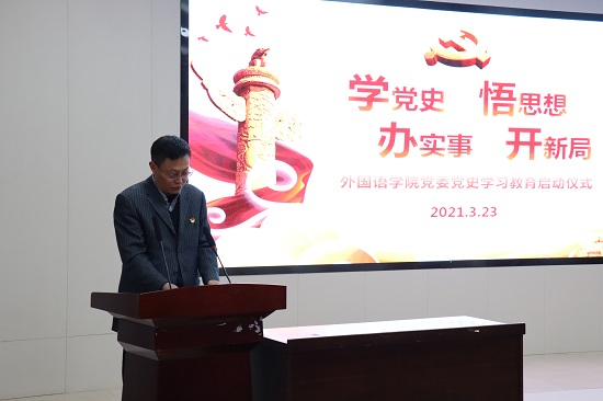 3月23日下午,外国语学院在文科楼A100圆厅学术报告厅举行党史学习教育启动仪式。学院党政班子成员以及全院师生党员、发展对象共计200余人参加仪式。仪式由专职组织员汪功伟主持。