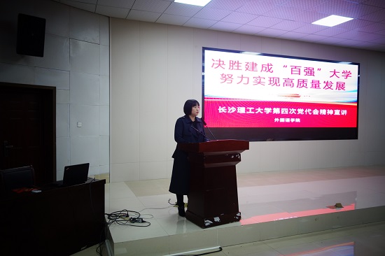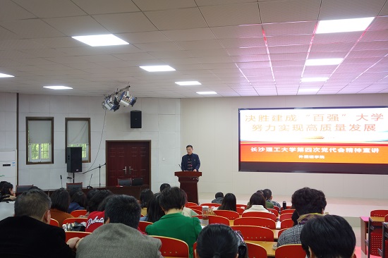 随后,院长段胜峰结合学院实际情况全面系统地为全院教职工宣讲了第四次党代会的精神并希望全院上下加强党代会精神的学习,勠力同心,为学校全面建成“百强”大学贡献外语力量。