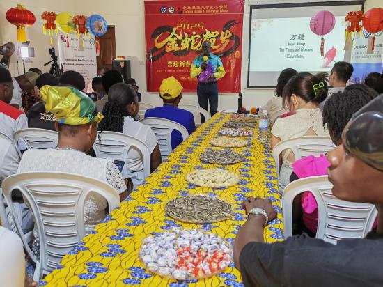 当地时间2025年1月25日,利比里亚大学孔子学院在中方教师驻地举办了一场热闹非凡的春节联欢会。此次联欢会吸引了援利医疗队、在利中资企业代表、孔院教学点负责人、众多师生、以及利国中文爱好者们的热情参与,近百人欢聚一堂,共庆2025中国农历新年的到来。利比里亚多家知名电视、广播及主流网络媒体对本次春节联欢会进行了全程直播及新闻报道。
