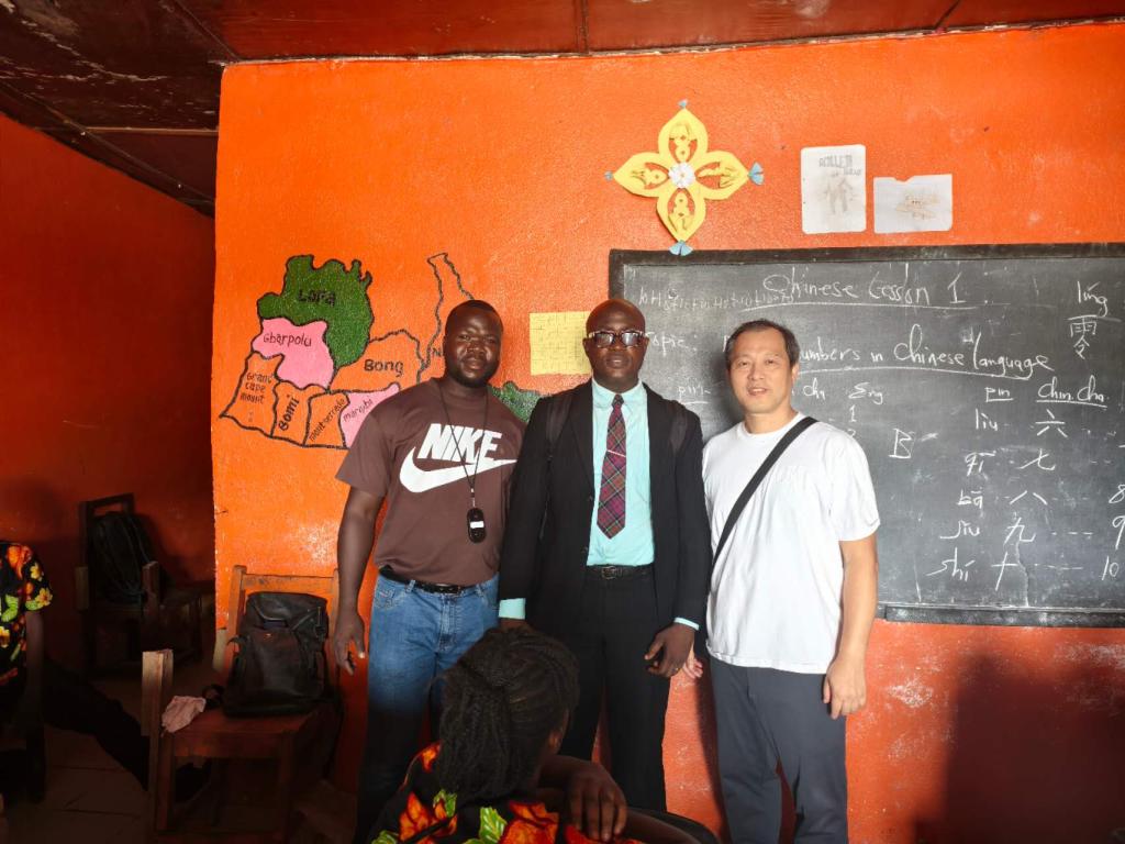 利大孔院与PFA学校的结缘,始于一段学生自发传播汉语的暖心故事。四年前,曾在利大孔院学习汉语的学生乔勇,主动在PFA学校开设汉语课程,让中文的种子在这所校园落地生根。2023年,乔远赴中国留学,临行前将这份汉语教学的“接力棒”,交给了同样在利大孔院学习的学生所罗门,让这堂特别的“学生教学生”汉语课得以延续。而该校校长福禄摩(Flomo)先生始终对学生的汉语学习给予大力支持,积极鼓励更多学生走近中国语言与文化,为校园营造了浓厚的汉语学习氛围。