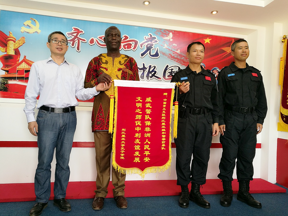 当地时间2018年2月13日,利比里亚大学孔子学院外方院长德克斯特(Dexter)、中方院长黄柏青博士携公派教师及志愿者教师等9人前往中国第五支驻利比里亚维和警察防暴队驻地进行锦旗赠送活动,向防暴队表达新春祝福。