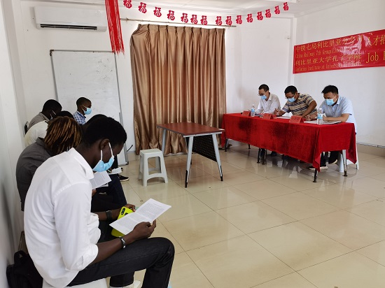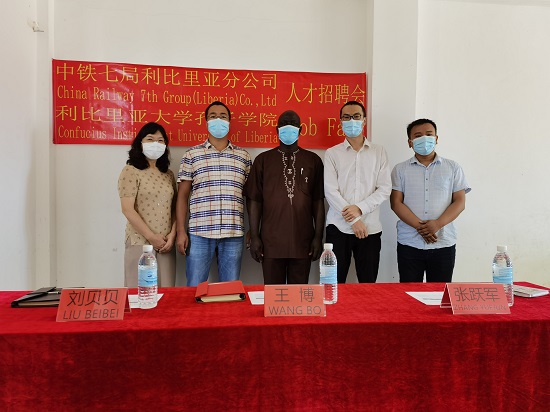 蒙罗维亚时间5月22日,为拓宽孔子学院学生的就业渠道,利比里亚大学孔子学院与中铁七局利比里亚分公司携手举办了人才招聘会。招聘会在孔子学院驻地活动中心举行。中铁七局利比里亚分公司47.1KM项目经理王博一行三人、利比里亚大学孔子学院外方院长Dexter、中方院长周红专、部分孔子学院师生参加了此次活动。
