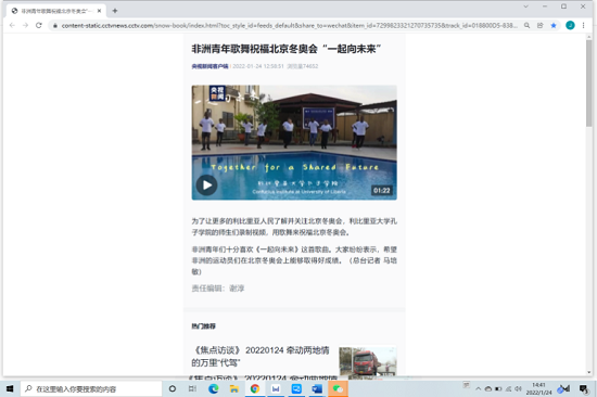 1.央视新闻以《非洲青年歌舞祝福北京冬奥会“一起向未来”》为题,对利比里亚大学孔子学院师生录制视频祝福冬奥会进行了专题报道,盛赞利大孔院在宣传冬奥会上所做出的努力。