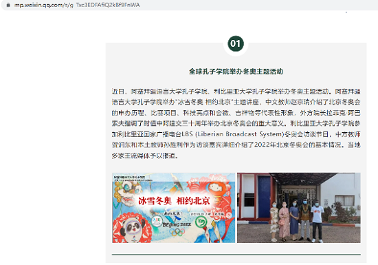 4. 中国国际中文教育基金会《孔子学院》今日孔院 | CI News以《全球孔子学院举办冬奥主题活动》为标题,报道了利比里亚大学孔子学院参加利比里亚国家广播电台LBS(Liberian Broadcast System)冬奥会访谈节目。