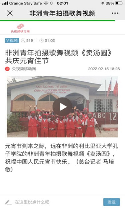 6.央视视频移动网以《非洲青年拍摄歌舞视频“卖汤圆”,共庆元宵佳节》为标题,对利比里亚大学孔子学院师生共庆中国传统节日进行了报道。