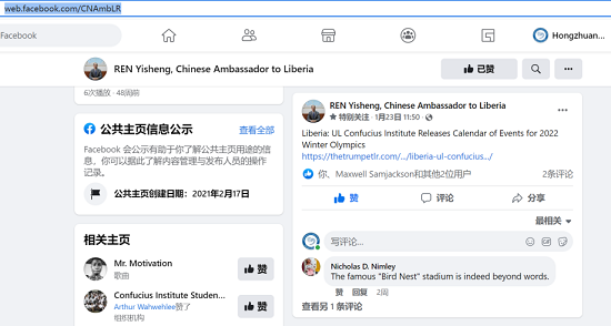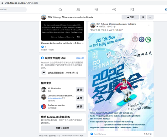 5. 中国驻利比里亚任义生大使在Facebook上为利大孔院电台脱口秀节目介绍2022北京冬奥会打Call;节目之后,任义生大使又在Facebook上转发了利比里亚Daily Observer报纸和Trumpet报纸上关于利大孔院此次活动的相关报道。任义生大使充分肯定了利大孔院在推介冬奥会,传播中国文化上所取得的丰硕成果。