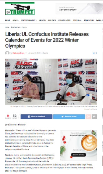 8. 利比里亚著名报纸The Trumpet发表文章“Liberia: UL Confucius Institute Releases Calendar of Events for 2022 Winter Olympics”,对利大孔院电台脱口秀节目介绍2022北京冬奥会活动进行了报道。该报道盛赞利大孔院的脱口秀节目,使更多的利比里亚人民了解了北京冬奥会。