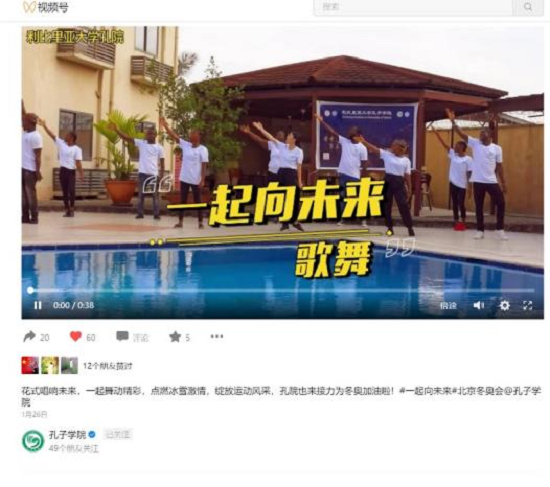 3 . 中国国际中文教育基金会《孔子学院》视频号上的报道。花式唱响未来,一起舞动精彩,点燃冰雪激情,绽放运动风采。利比里亚大学孔子学院用歌舞《一起向未来》为北京冬奥加油。