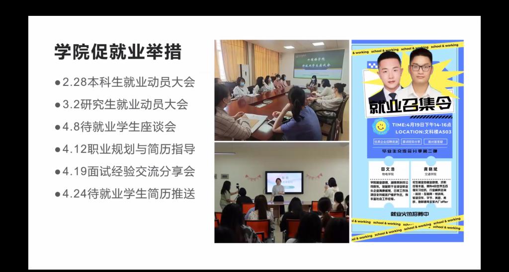 此次会议既是对前期就业工作的总结,也是对最后百日冲刺促就业的预热。外国语学院将持续推进2022届毕业生的就业工作,全力促进更加充分更高质量就业。