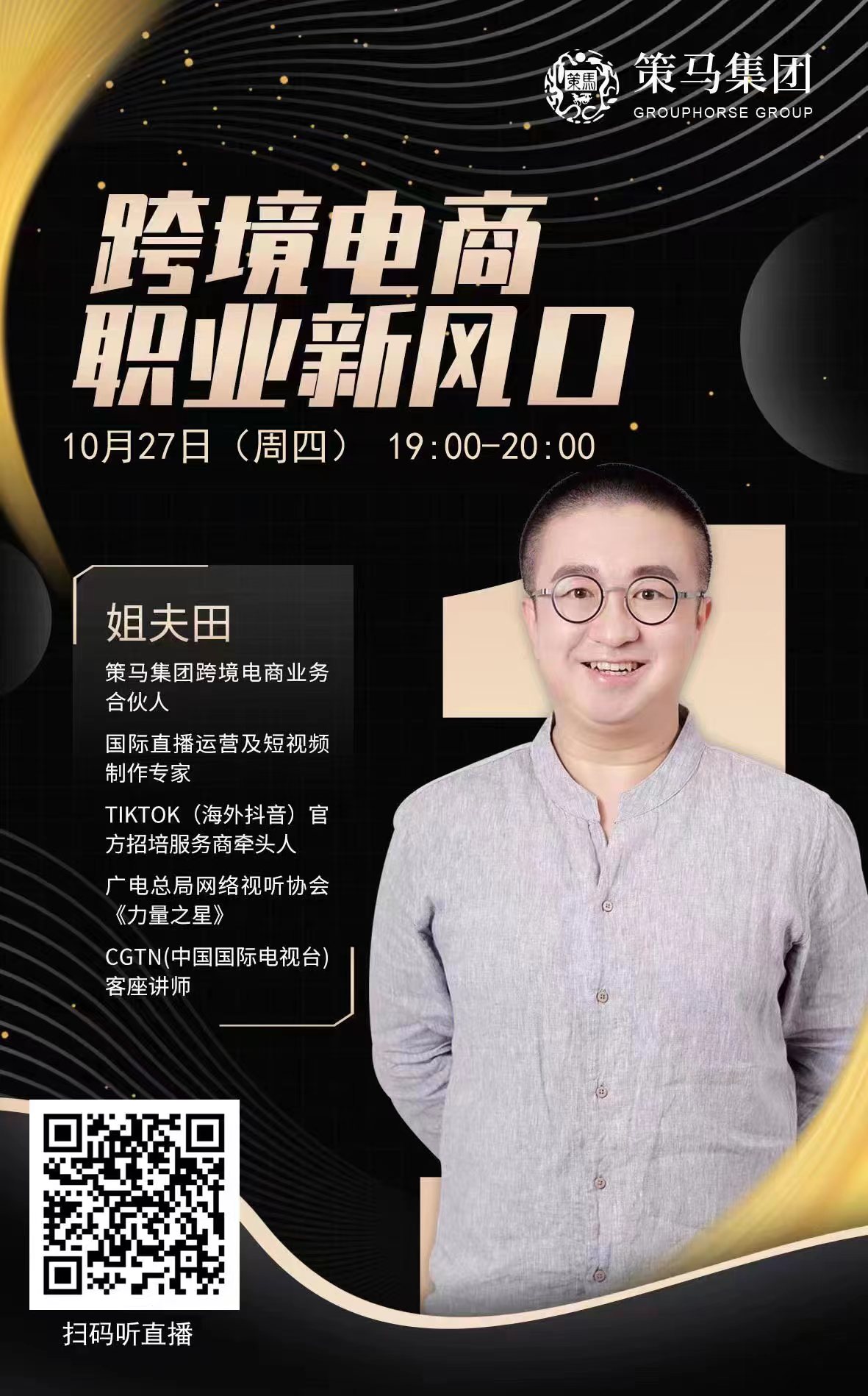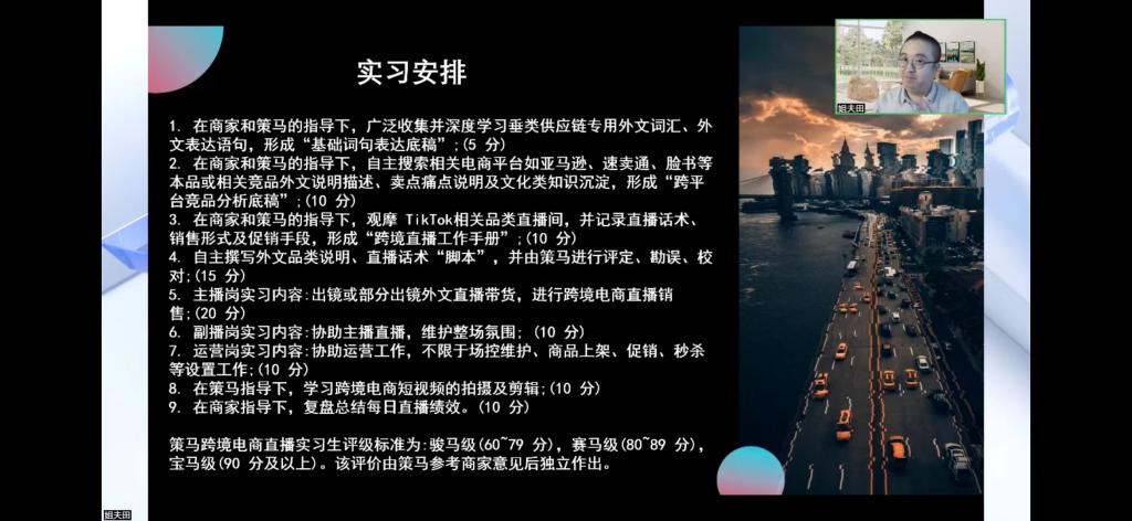 本次直播讲座邀请到了策马集团跨境电商业务合伙人、国际直播运营及短视频制作专家、TIKTOK(海外抖音)官方招培服务牵头人姐夫田为外语专业的同学们解析就业新形势和风口行业。姐夫田以幽默风趣的方式向全体同学全面介绍了TIKTOK跨境电商行业缺口,并分析了国际新形势及新兴产业的潜在需求。他通过分享自己牵头负责运营TIKTOK的经历来带同学们走近新兴行业,并通过与大家互动激发同学们对跨境电商了解的兴趣。此外,他积极鼓励同学们抓住时代新风口,通过参加实习实践走近跨境电商行业。