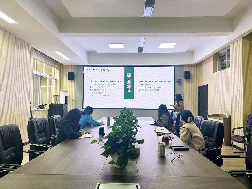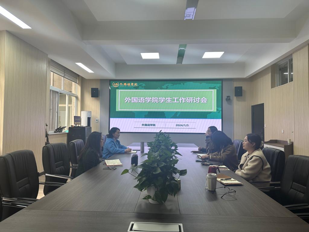 为明确2024年学生工作思路,把准工作方向,外国语学院于15日上午在3214会议室召开学生工作研讨会。外国语学院党委书记文丽丽、党委副书记周芳出席会议指导,学工办全体辅导员依次汇报。