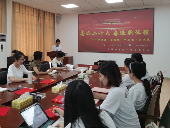 9月21日中午,学院本科生党支部在文科楼A603开展以“喜迎党的二十大,奋进新征程——学讲话,悟思想;解疑难,创未来”为主题的师生座谈会。此次座谈会由党建宣传组李婉彤主持,学生党支部书记武巧琳、毛婕出席,外国语学院本科生党支部全体党员参加。