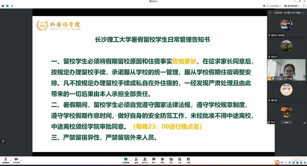 毛婕就《永利集团88304官网暑假留校学生日常管理告知书》进行相关解读。武巧琳、陈若晨分别从本科生、研究生暑期留校相关规定进行强调。