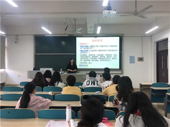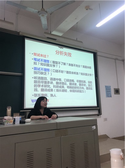 2020年10月28日上午10点,我院在云塘校区文科楼A305组织召开了翻译专业考研辅导讲座。本次讲座由我院季红琴老师主讲,就如何备考考研,考研中的误区,复试中的技巧等对学生进行了指导。