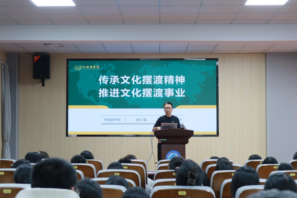 为更好的帮助学生了解永利官网“文化摆渡”事业发展情况,10月16日晚7:00,外国语学院在金盆岭校区三教321报告厅举办了题为“传承文化摆渡精神,推进文化摆渡事业”的通识教育讲座暨2025级新生“书记第一课”。本次讲座邀请了我院党委书记陈仁凯老师担任主讲,外国语学院党委副书记周芳、辅导员郭恒以及2025级全体新生到场参加,本次活动由郭恒老师担任主持。