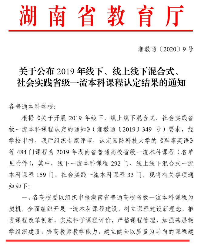 近日,湖南省教育厅(湘教通〔2020〕9 号 )颁布《关于公布 2019 年线下、线上线下混合式、 社会实践省级一流本科课程认定结果的通知》,全省共有484 门课程被认定为2019 年湖南省普通高校省级一流本科课程,永利集团88304官网共获批15门,其中包括我院黄坚教授申报的《通用工程英语听说》。这是继我院英语专业入选省级一流本科建设专业点以来,我院专业建设取得的又一重大突破,并且下一步将上报教育部冲击国家一流本科课程。