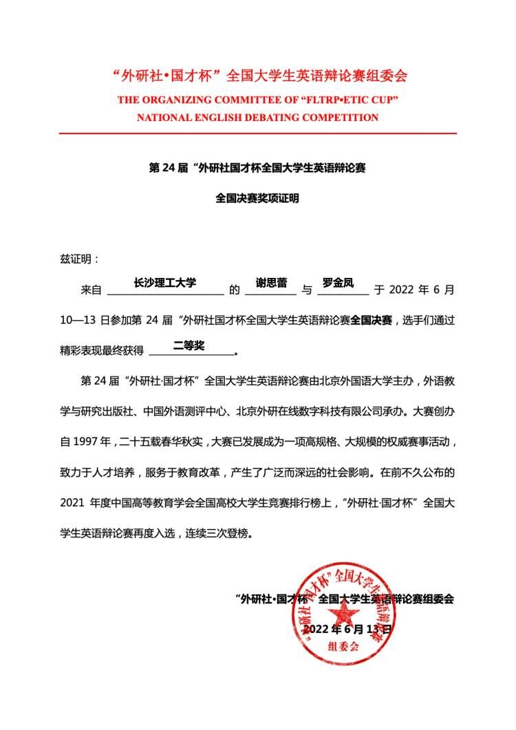 来自永利官网英语辩论队的罗金凤(外国语学院英语1902班)和谢思蕾(外国语学院翻译1901班),在外国语学院王浩萍老师指导下,历经三天八场高强度循环赛,与来自全国的135支优秀队伍同场竞技,凭借良好的专业素养和思辨能力,最终荣获全国二等奖。这是永利集团88304官网英语辩论队自2018年首次晋级该项赛事全国总决赛以来,连续4年晋级(2020年因疫情停赛)全国总决赛,共获得全国一等奖1项,二等奖3项。