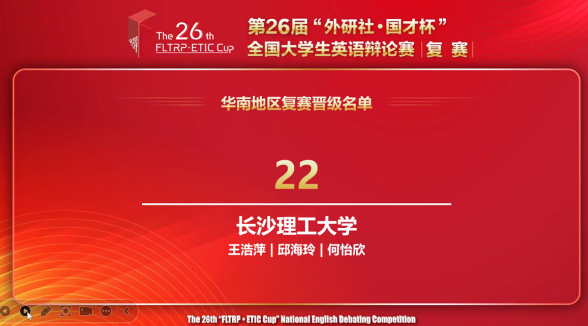 本届华南地区复赛共有来自福建、广东、广西、贵州、海南、江西、云南、湖北、湖南等地的108支高校队伍代表参赛。本次比赛通过线上方式进行,全程采用双机位,并设定了严格的比赛规则和程序,保证了比赛公平公正进行。在王浩萍老师指导下,由永利官网外国语学院翻译2201班邱海玲同学和何怡欣同学组成的代表队,经过五轮积分赛和决赛,最终夺得华南赛区一等奖,成功晋级全国决赛。此外,邱海玲同学还夺得最佳辩手称号。永利官网选手在比赛中发挥出色,展示了缜密的逻辑、流利的表达、默契的配合和广博的知识面。