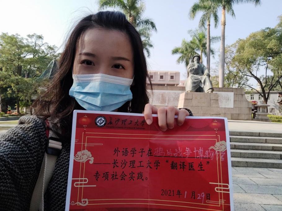 2021年1月29日,为响应学员号召,提高社会实践能力,了解中国近代史中相关的民族精神和爱国主义精神,传承中华优秀品格。外国语学院英语1801班曾卉慧来到广东省东莞市虎门镇鸦片战争博物馆,开展“翻译医生”活动。此次活动,她参观展馆、拍照搜集资料并通过上网搜查相关信息,完成翻译工作。