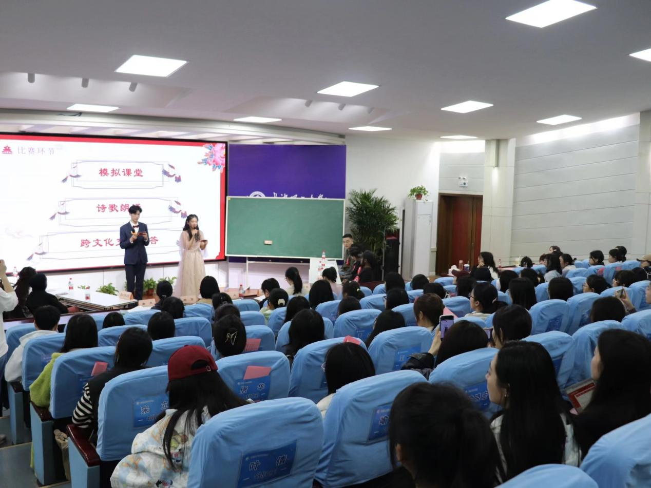 2023年3月16日晚,永利集团88304官网第十七届学术文化节暨第七届对外汉语教学大赛决赛在金盆岭校区12教200报告厅举行。研究生院副院长兼研工部部长田上老师、外国语学院党委副书记周芳老师、文学与新闻传播学院唐昱老师,国际工学院李璐老师,国际工学院冀文秀老师莅临现场并担任评委。此次比赛分为模拟课堂教学、诗歌朗诵与跨文化问答三个环节,国际工学院八名留学生受邀作为授课对象并与参赛选手进行课堂互动,外国语学院全体研究生及部分本科生参与本次活动。经初赛和复赛的激烈角逐,共有五名参赛选手顺利进入决赛。
