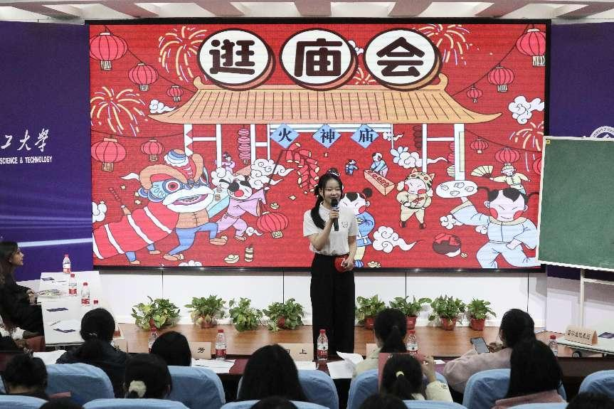 陈博文同学的授课主题为《走进湖南侗族非遗文化》,她通过侗锦图片引起学生对侗族文化的兴趣,进而引出重点中文句式“名词+很(副词)+形容词”,分别从侗锦的用途、侗锦的织造技艺以及侗族大歌为例实操句式。易安琪同学的授课主题为《浏阳烟花》,她以新颖有趣的谜语导入课程主题,重点教授同学们如何从形状、颜色以及声音来描述烟花,学习“像”字句及句式运用。聂晴同学的授课主题为《苗族服饰》,她以苗族服饰变装的视频导入,切入课程重点:是非句,通过句型对比直观明了地展示是非句的结构。邹玲玲同学的授课主题为《和我一起逛庙会》,她通过生动的图片让同学们直观地体会庙会中的舞狮、戏剧、糖画等中国传统文化,并与课程重点句型结构“人/事物+很+形容词=人/事物+形容词+极了”相结合。贺梦洁同学的授课主题为《板桥荷花灯会》,通过对板桥荷花灯会的简单介绍,引出关羽、何仙姑以及保家卫国的战士等相关人物及其特点,引导同学们运用与灯会有关的词语进行造句。