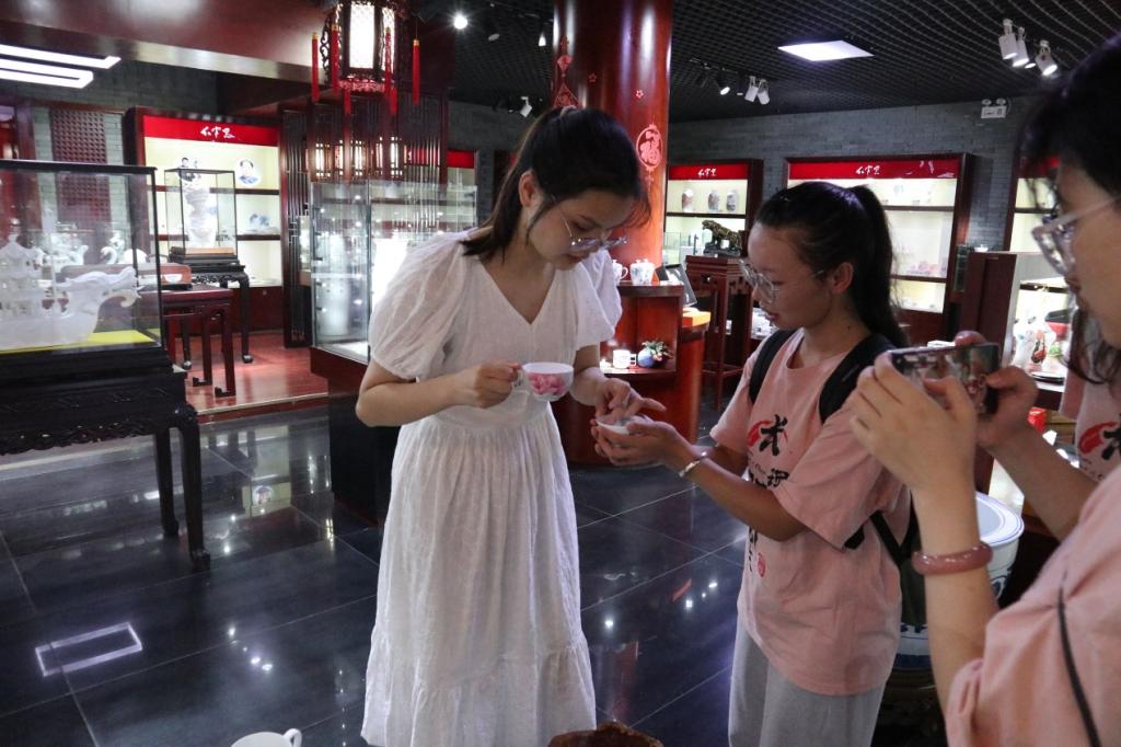 为进一步加深对醴瓷工艺的了解,实践团于7月6日前往红官窑进行调研。跟随着工作人员的脚步,实践团参观了红官窑的销售门店、制造车间和大师工作室,亲身感受醴瓷的诞生。队员们现场观摩了“双勾分水”技法和醴陵釉下五彩瓷工艺流程。从拉坯、修坯、勾线到彩绘,每一个步骤都令人惊叹。五彩艺术大师张志坚为实践团讲解了一些醴瓷的专业知识,并且他指出,“醴瓷的推广与传承,不仅需要政府的支持,也需要社会共同的努力。希望你们能够利用你们的专业知识和平台帮助我们宣传,让世界看见和认识醴瓷。”